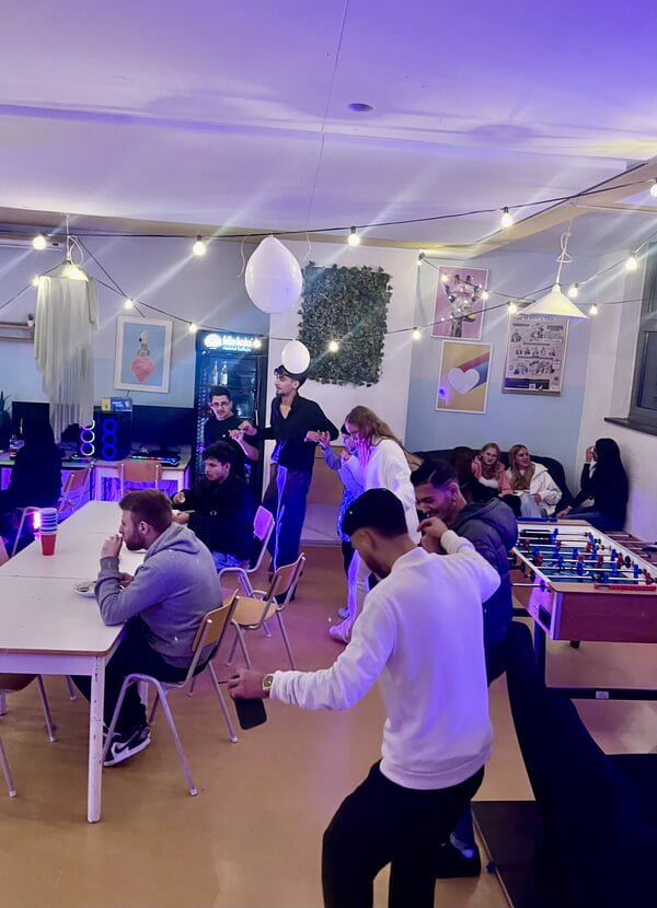 Im Café Mint selbst haben wir mit Lichterketten, bunten Strahlern und Schwarzlicht eine besondere Stimmung geschaffen. Auf der Mint Stage unten wurde mit leuchtenden Tischtennisbällen gespielt. Im Café Mint wurde wild und außegelassen getanzt.