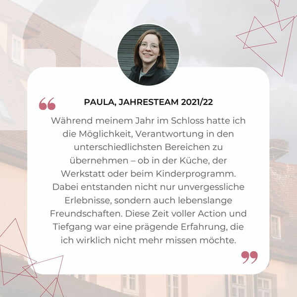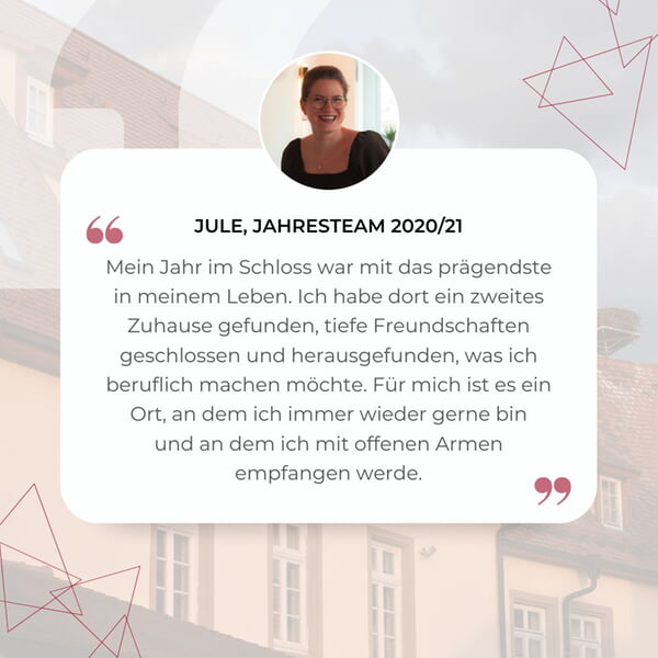 "Mein Jahr im Schloss war mit das prägendste in meinem Leben. Ich habe dort ein zweites Zuhause gefunden, tiefe Freundschaften geschlossen und herausgefunden, was ich beruflich machen möchte. Für mich ist es ein Ort, an dem ich immer wieder gerne bin und an dem ich mit offenen Armen empfangen werde."