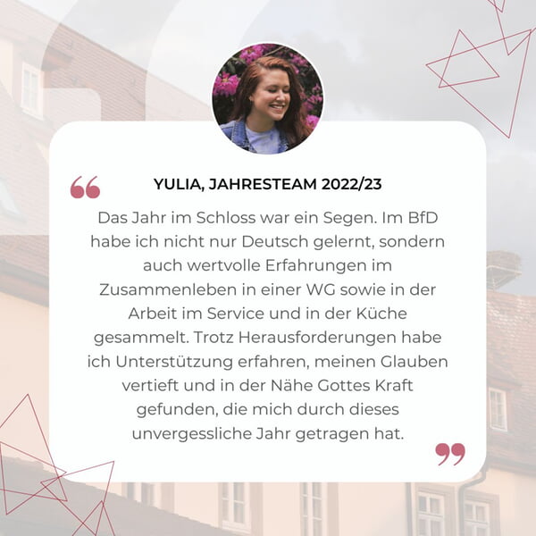 "Das Jahr im Schloss war ein Segen. Im BfD habe ich nicht nur Deutsch gelernt, sondern auch wertvolle Erfahrungen im Zusammenleben in einer WG sowie in der Arbeit im Service und in der Küche gesammelt. Trotz Herausforderungen habe ich Unterstützung erfahren, meinen Glauben vertieft und in der Nähe Gottes Kraft gefunden, die mich durch dieses unvergessliche Jahr getragen hat."