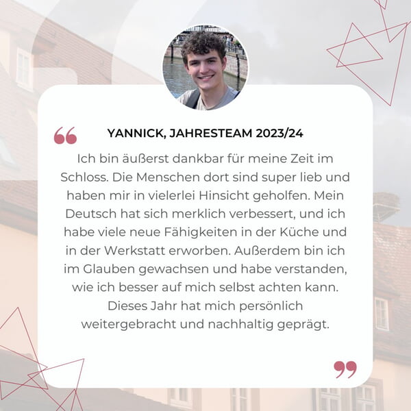 "Ich bin äußerst dankbar für meine Zeit im Schloss. Die Menschen dort sind super lieb und haben mir in vielerlei Hinsicht geholfen. Mein Deutsch hat sich merklich verbessert, und ich habe viele neue Fähigkeiten in der Küche und in der Werkstatt erworben. Außerdem bin ich im Glauben gewachsen und habe verstanden, wie ich besser auf mich selbst achten kann. Dieses Jahr hat mich persönlich weitergebracht und nachhaltig geprägt."